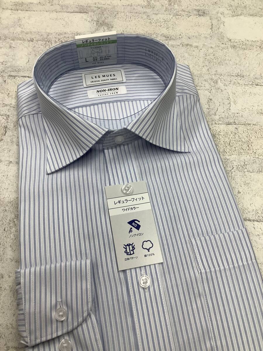 - 41-86 長袖Lサイズ ★綿100%★ワイドカラー★ドレスシャツ ブルー系ストライプジャガード生地 ノンアイロンコットン