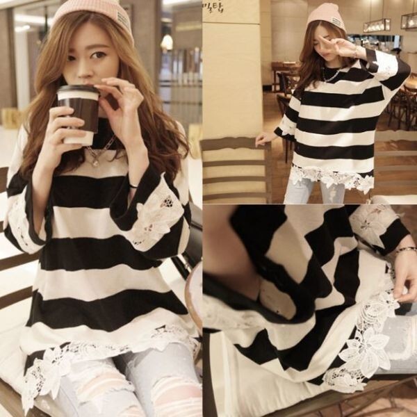 > チュニック 長袖 ロング丈 M ボーダー レース トップス カットソー ゆったり ロンT トレーナー 新品 YLH231