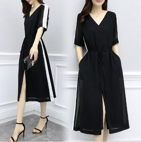 - ワンピース レディース 40代春夏マキシ丈ワンピースきれいめ 大きいサイズ Vネック 通勤シフォンワンピース リボン付き 半袖YWQ1373