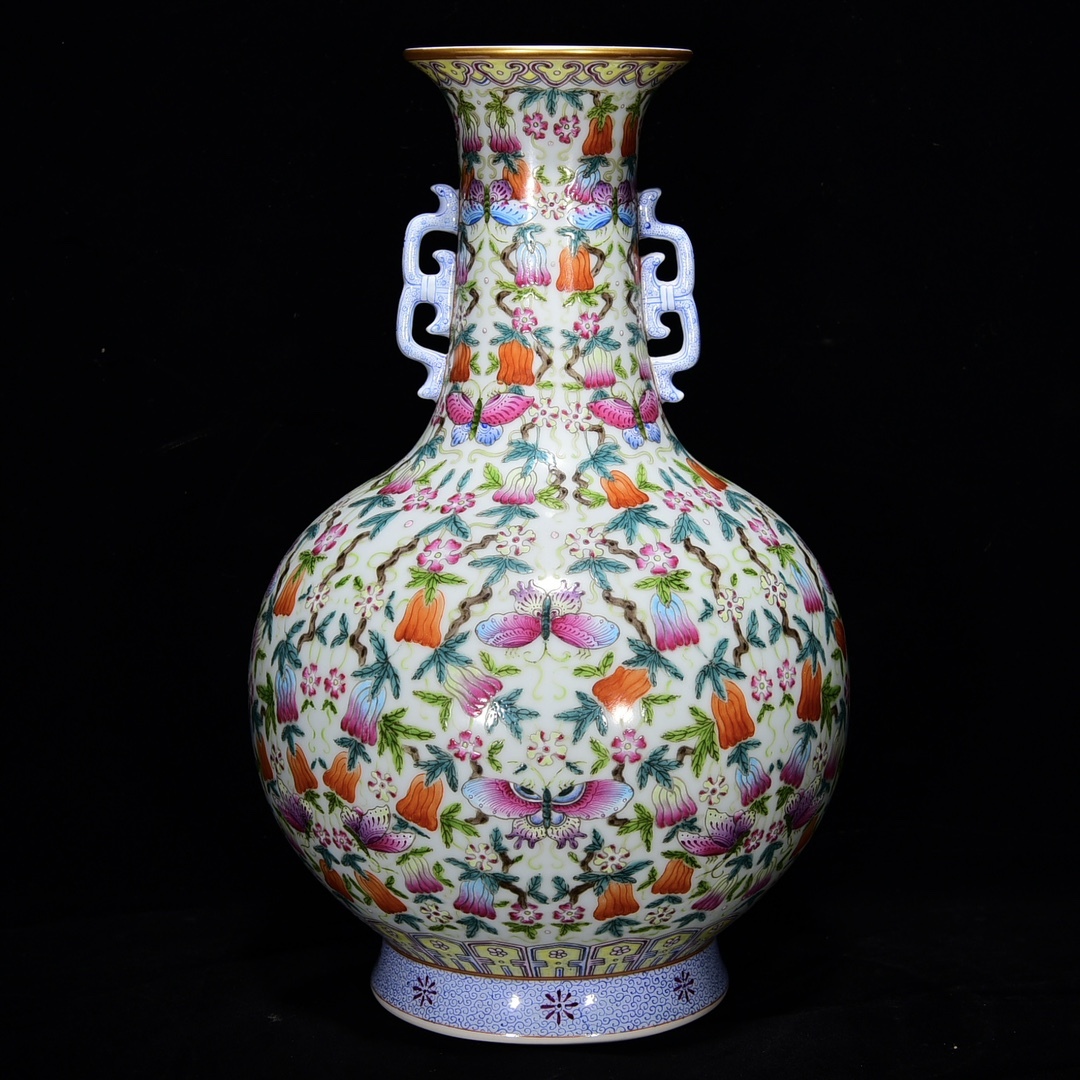 - ◆旧家蔵出◆古美術 中国古玩 大清乾隆年製款 粉彩 蝶紋花卉双耳瓶 骨董 古賞物 時代物 A06