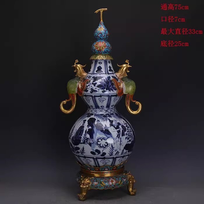 > ◆旧家蔵出◆古美術 中国古玩 元代 元青花 纏枝蓮花 嵌銅胎 琺瑯彩人物故事図葫芦瓶 骨董 古賞物 時代物 CN01