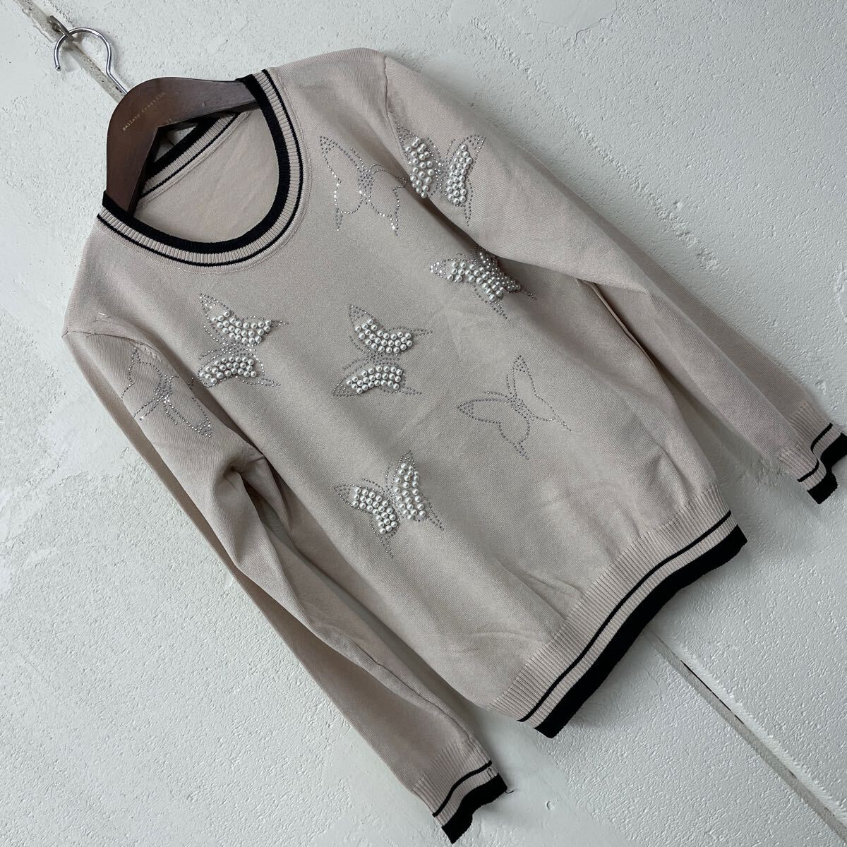 - 訳あり蝶々柄パール使いサラサラニット ベージュ