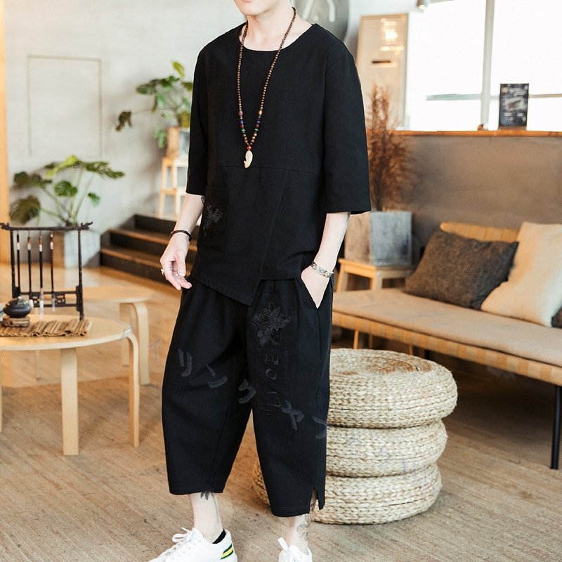 - ☆新品メンズ 綿麻リネン ジャージスウェット 夏 上下2点セットアップ Tシャツ ハロンパンツ サルエルパンツ 大きいサイズ 黑 M~5XL