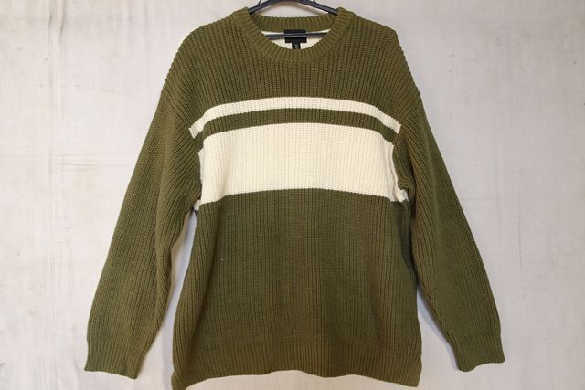 - H&M/エイアンドエム/長袖セーター/クルーネック/綿・アクリル混ニット/裾サイドスリット/ツートン/カーキ/オフホワイト/EURサイズL(11/22R)
