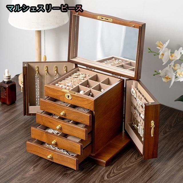 - 木製 ジュエリーボックス 高級感 宝石箱 収納 鏡付き 5段収納 大容量 指輪 保管 携帯 小物入れ ジュエリーケース