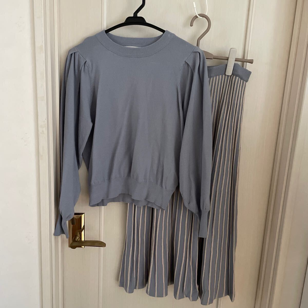 - globeグローブ ニット セットアップ スカート ストライプ セーター 長袖 ニット ブルー