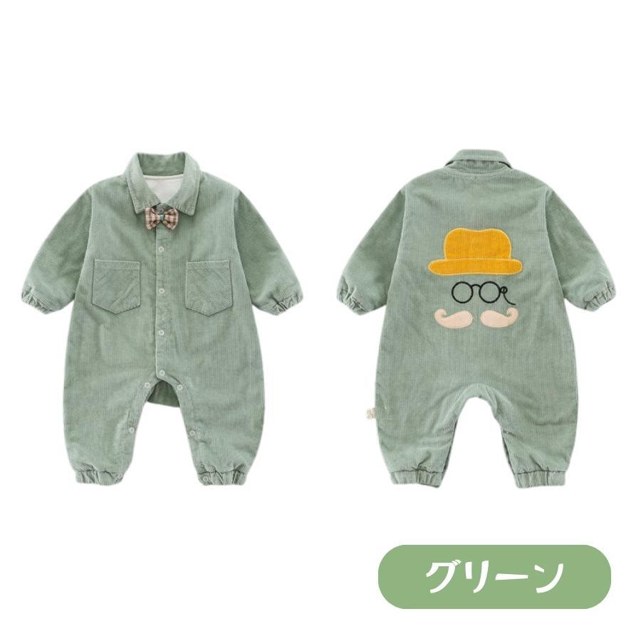 > コーデュロイ素材 ヒゲ柄 蝶ネクタイ ロンパース つなぎ やわらか 韓国子供服 おしゃれ 乳幼児 キッズ ベビー服 (66, グリーン)