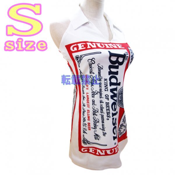 - 【高品質プリント 伸縮可能】バドワイザーバドガール 襟つき 白 コスプレ S ワンピース ホワイト 新品未使用 !送料無料!!