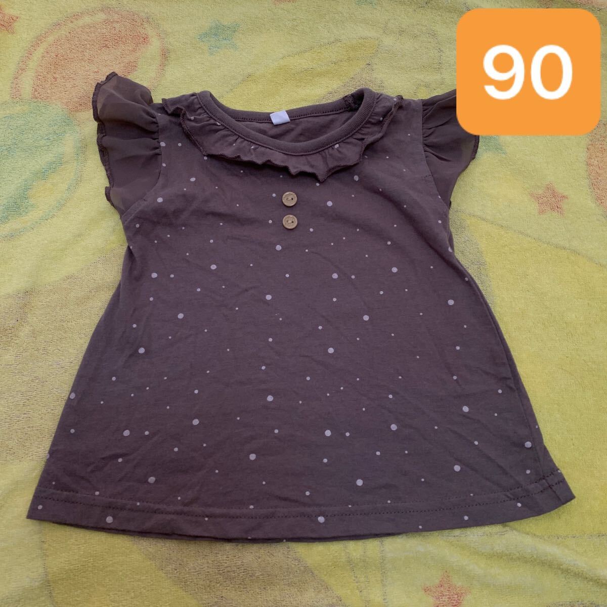 - チュール袖 フリル襟 ボタン ドット ブラウン Tシャツ カットソー 90