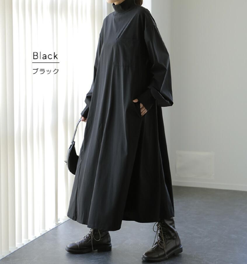 - 秋冬/ロング丈ワンピース ナチュラル 長袖 マキシ丈ワンピース 大きいサイズ リブタートルネック がおしゃれな 軽い Aライン/黒