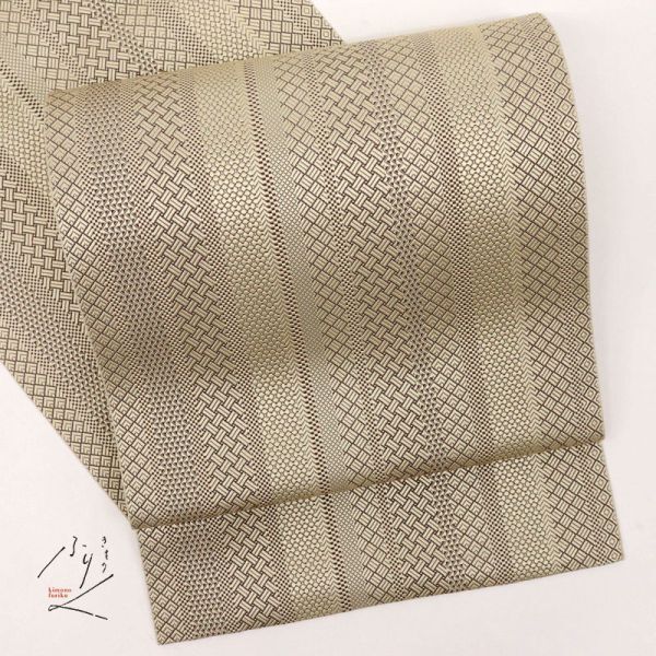 > 【名古屋帯】 本場筑前秋月 博多帯 『小森久』 幾何学 本草木染 白茶 正絹着物 NY3-1