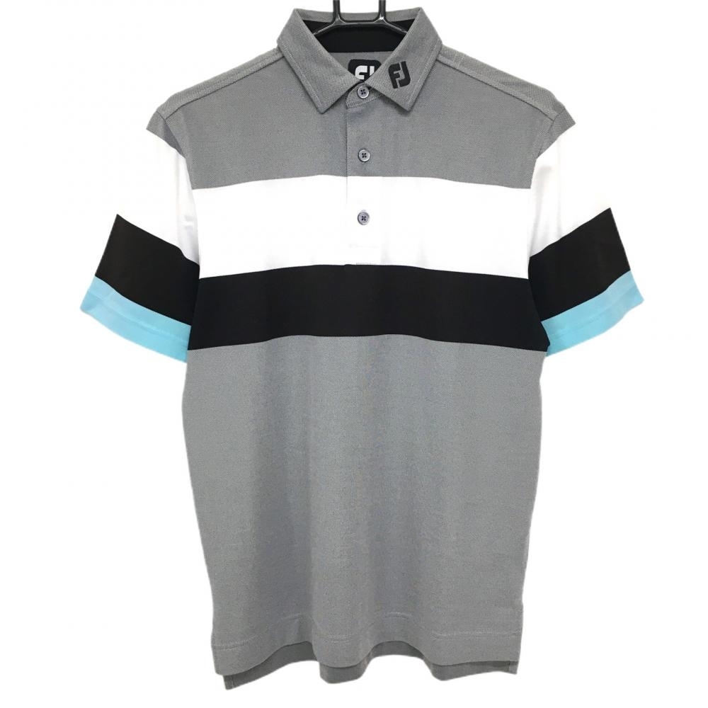 > 【超美品】フットジョイ 半袖ポロシャツ グレー×黒 ボーダー調 襟ロゴ刺しゅう メンズ L ゴルフウェア FootJoy