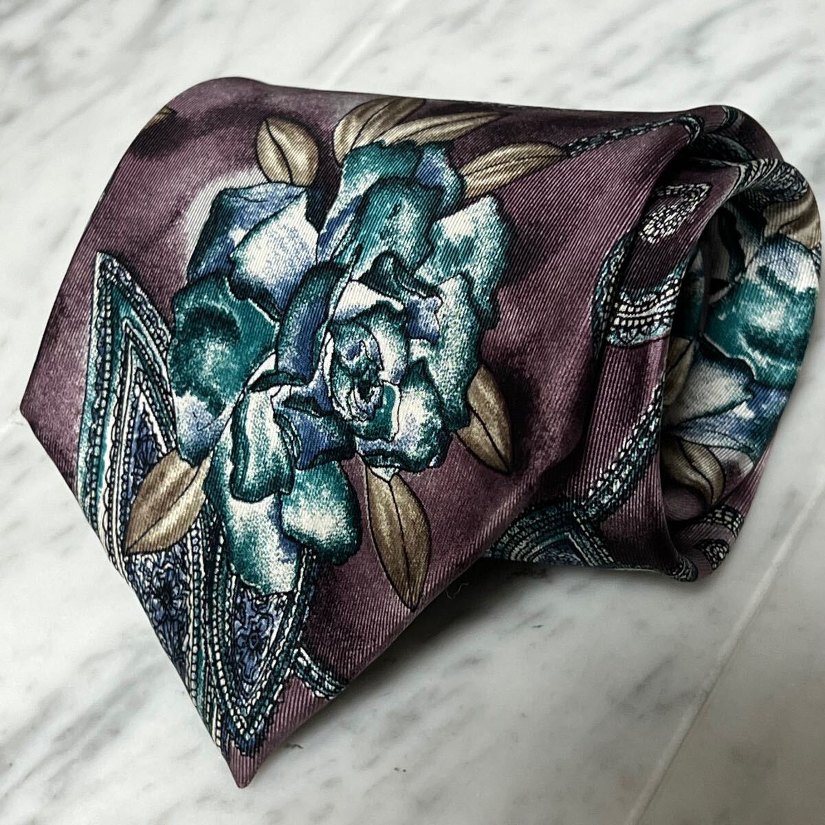 - 【未使用】 999円~ ネクタイ パープル 花柄 ボタニカル柄 バラ 総柄 silk100% (R5)