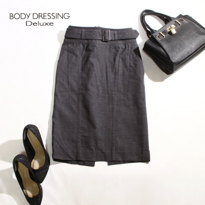 > 美品 BODY DRESSING Deluxe ボディドレッシング デラックス ベルト付き ウール タイトスカート 7号 36 レー オフィス 通勤 フォーマル 冬