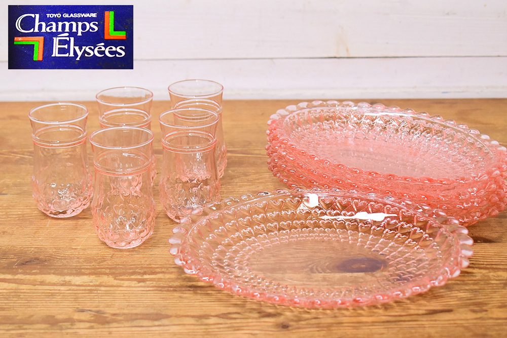 > ●昭和レトロ/ハート/ピンク/桃色/TOYO GLASSWARE/ガラス食器/かわいい/皿/コップ/シャンゼリゼシリーズ/10点セット/UZD300