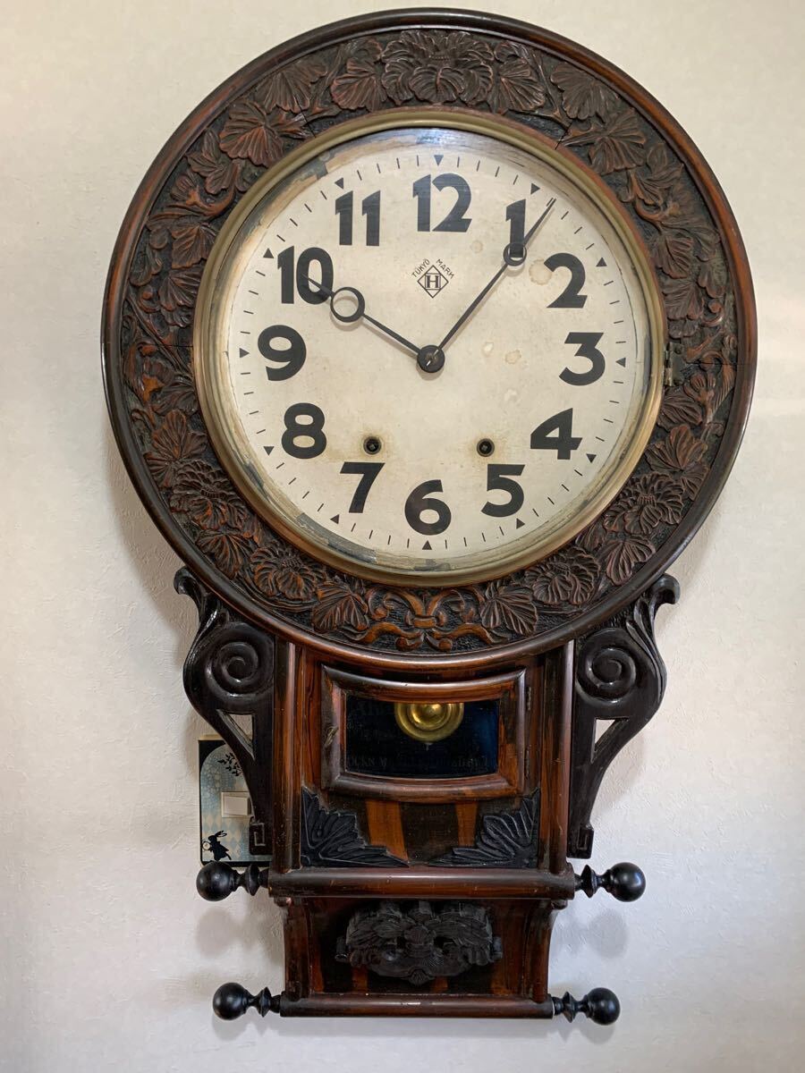 - KOSEISHA ニューヘブン 鎌倉彫 巻物型 柱時計 掛時計 ボンボン時計 USA NEW HAVEN 振り子 ゼンマイ式 アンティーク レトロ