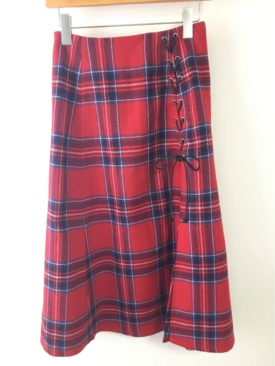 > 美品 CECIL McBEE セシルマクビー ロングスカート チェック フリーサイズ 裏地 編み上げ レッド 赤