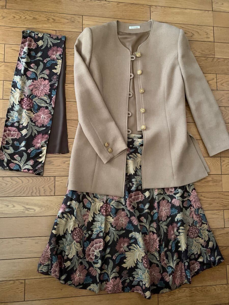 - LA SUAMER ラシュメール レディース セットアップ ストール付 9号 スーツ ベージュ ジャケット フレアスカート 花柄 ひざ丈