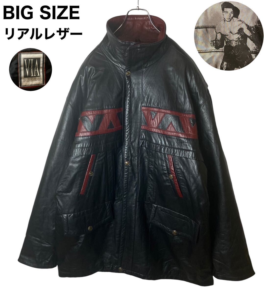 - レトロ古着ビッグサイズ スタンドカラーリアルレザージャケット柄入りオシャレ裏地
