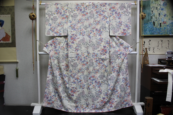 > きもの今昔8030 小紋のきもの 広衿袷手縫い仕立きもの アイボリー地色に花籠柄の小紋 シツケ付ですが 身丈162cm