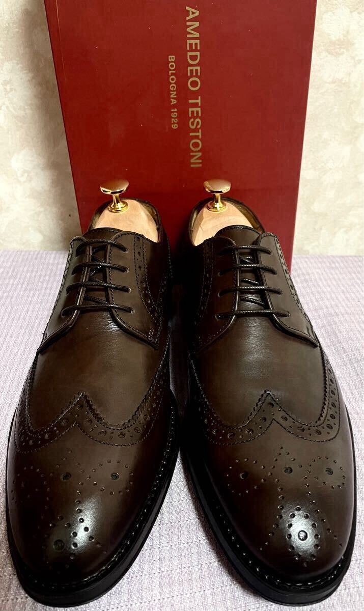 - 未使用!世界の紳士を魅了し続けるイタリア革靴トップブランドa.testoniカーフ高貴艶ダークブラウンウィングチップ逸品シューズ約13万円相当