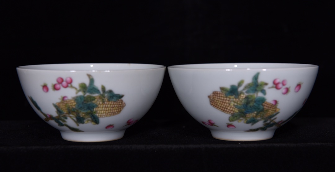- ◆旧家蔵出◆古美術 中国古玩 大清雍正年製款 粉彩 玉米 草虫碗―對 置物 擺件 古賞物 擺件 骨董 時代物 A06