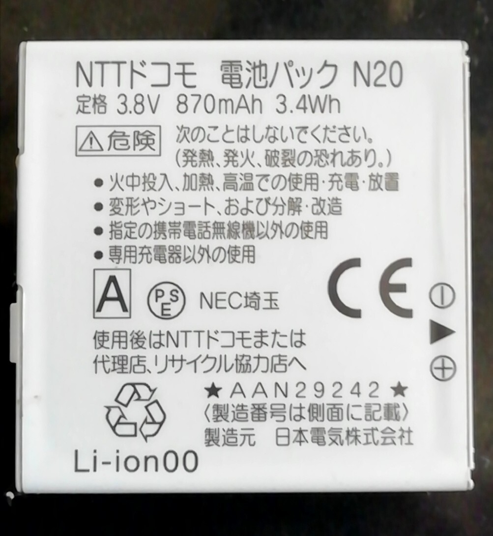 - 【中古・残り1個】NTTドコモN20純正電池パックバッテリー【充電確認済】対応機種(参考)N-05A/N-03C