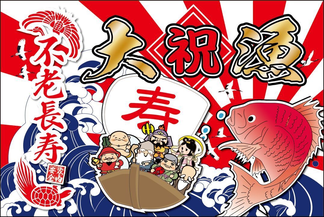 - タペストリー横断幕「祝大漁 不老長寿 七福神 大漁旗 寿船 鶴亀 誕生日 お祝い 真鯛 えびす様 老人ホーム デイケア えびす様 大漁祭 寿司」