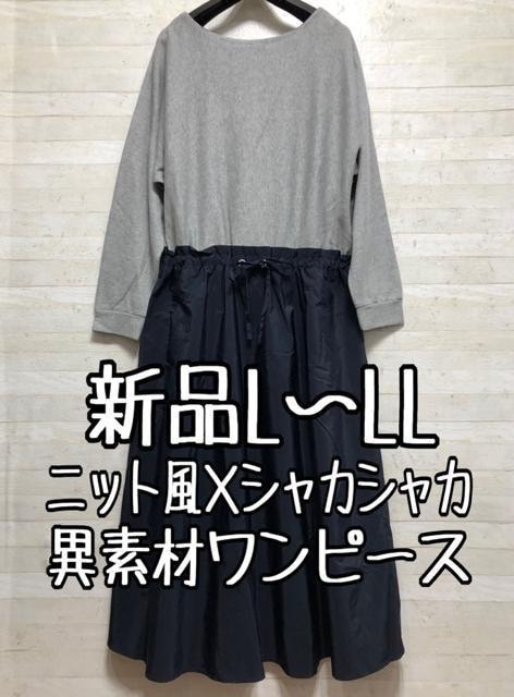 - 新品☆L~LL♪グレー×紺系♪異素材おしゃれロングワンピース〇B920