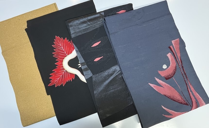 - 花とら●リサイクル帯 名古屋帯 4本まとめて ちりめん風 光琳梅 金 綴れ 錦織 漆箔 市松 リメイク 241217