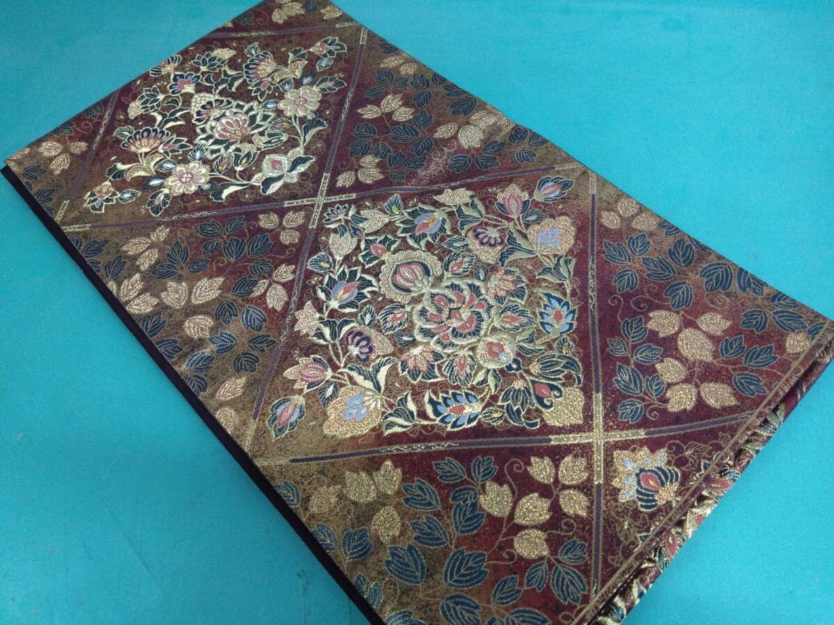 > ●159【菱取宝飾華紋】【彫金】ブラウン ゴールド 高級 袋帯 金彩 輝き 光沢 煌 雅 豪華絢爛 六通 帯 縁起物 中古 ③