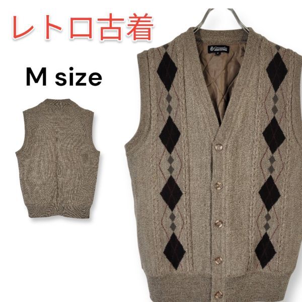 - グロッセロ ニット ベスト アーガイル ケーブル編み ブラウン 茶色 Mサイズ 暖かい中綿入り