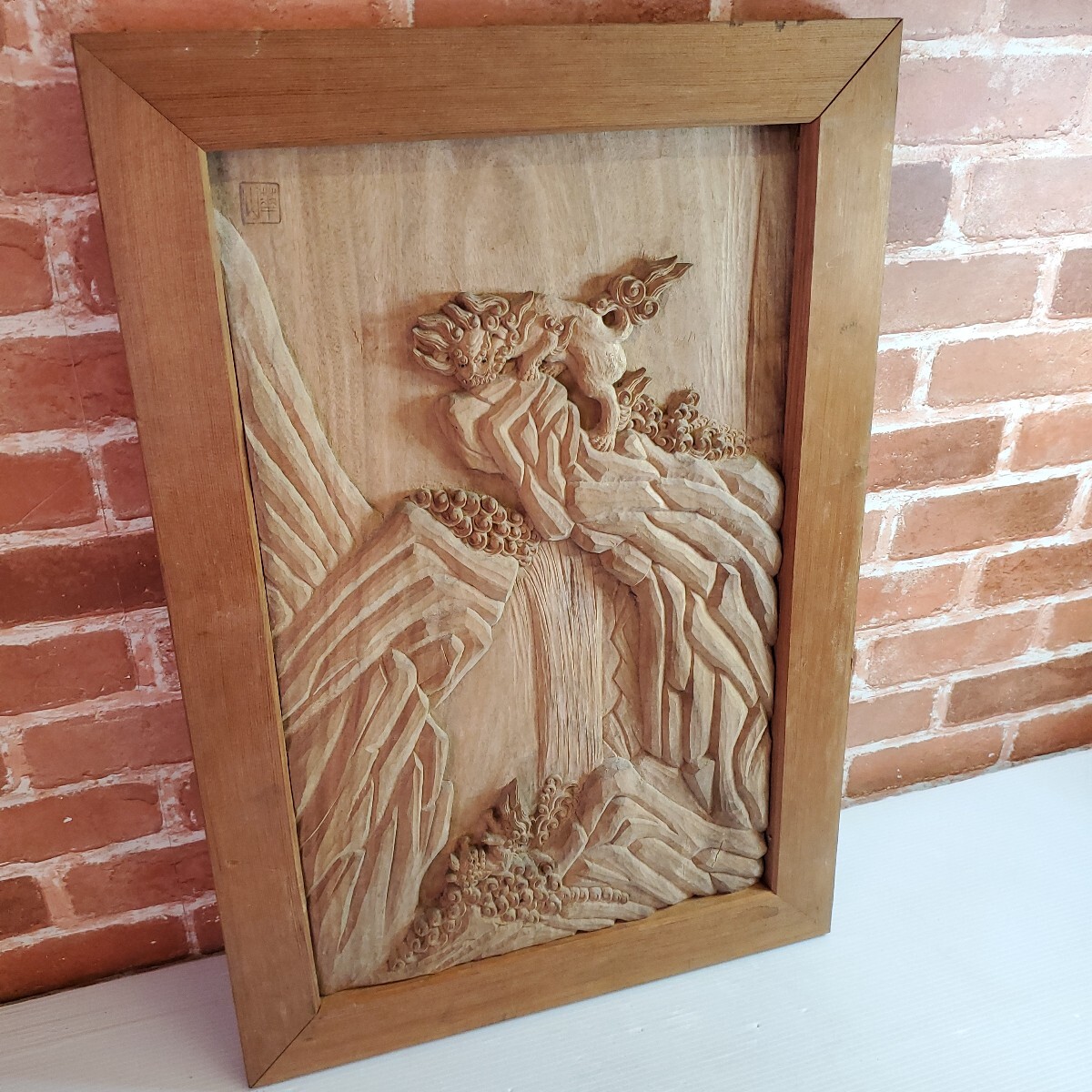 - 華山作 木製 彫刻 獅子の子谷落 浮彫 壁飾り 壁掛け 和風