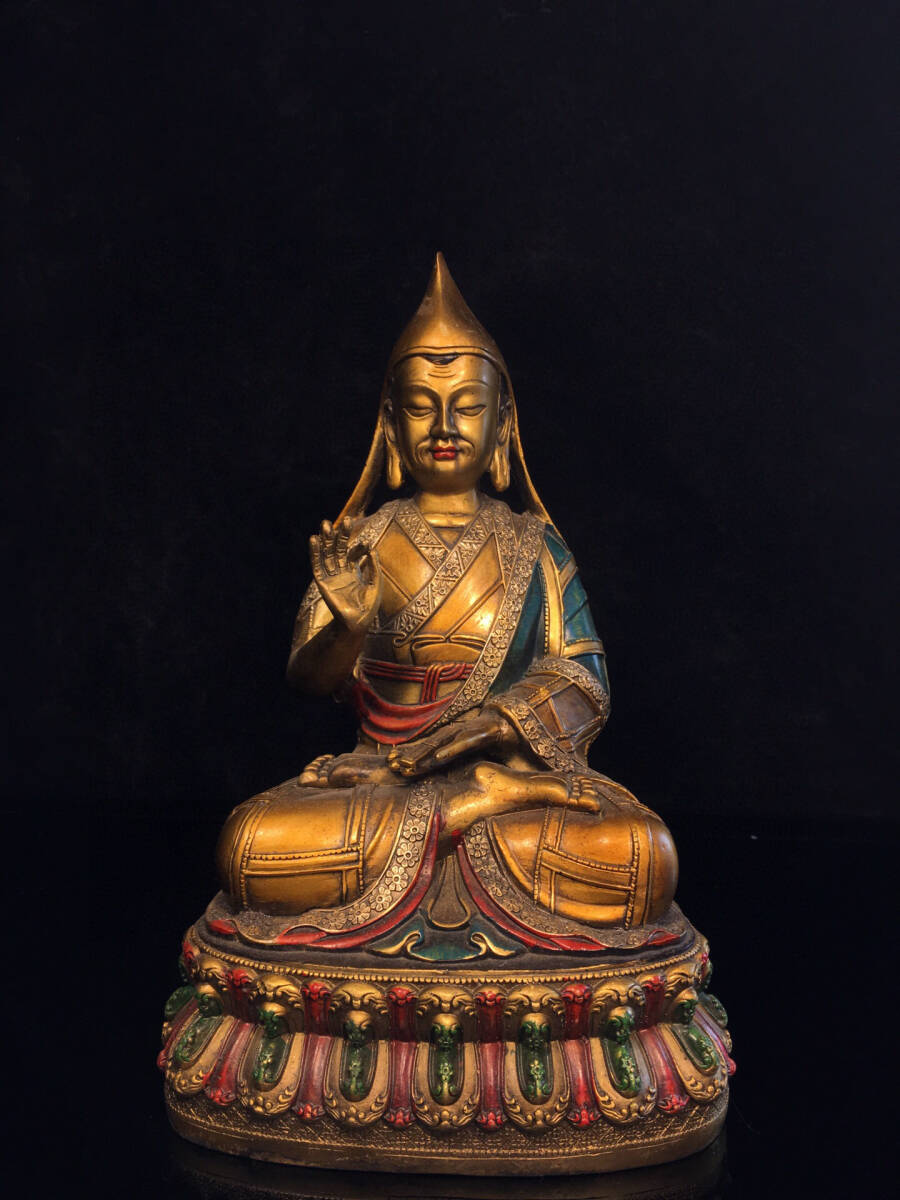 - 【超珍館蔵】銅製 金鍍 彩繪 宗喀巴像 置物 古賞物 古美術品 稀少珍蔵品