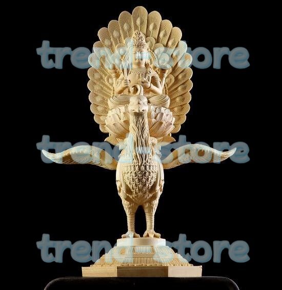 - 孔雀明王★尾羽光背孔雀台 木彫仏像守り本尊 除災 置物 祈る 厄除け 高さ39CM