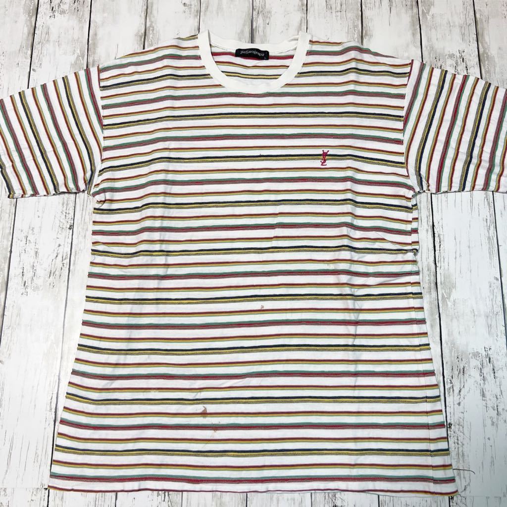> 90s YvesSaintLaurent イヴサンローラン ワンポイント ロゴ 刺繍 立体 マルチカラー ボーダー 半袖Tシャツ