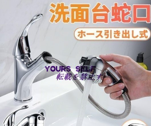 > 洗面台蛇口 混合水栓 キッチン用 シングルレバー混合栓 ホース引き出し式 整流 360度回転 シャワー切り替え可能 サテンメッキ 冷温切換え