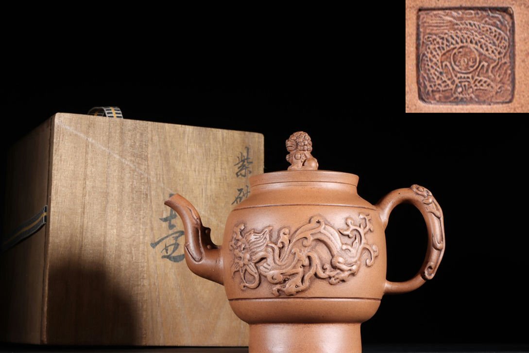 > ▼渡鶴羽▼P256時代朱泥 獣鈕貼塑紋執壺紫砂壺 印花 清時代 在銘 /紫砂 煎茶道具 朱泥 茶壺