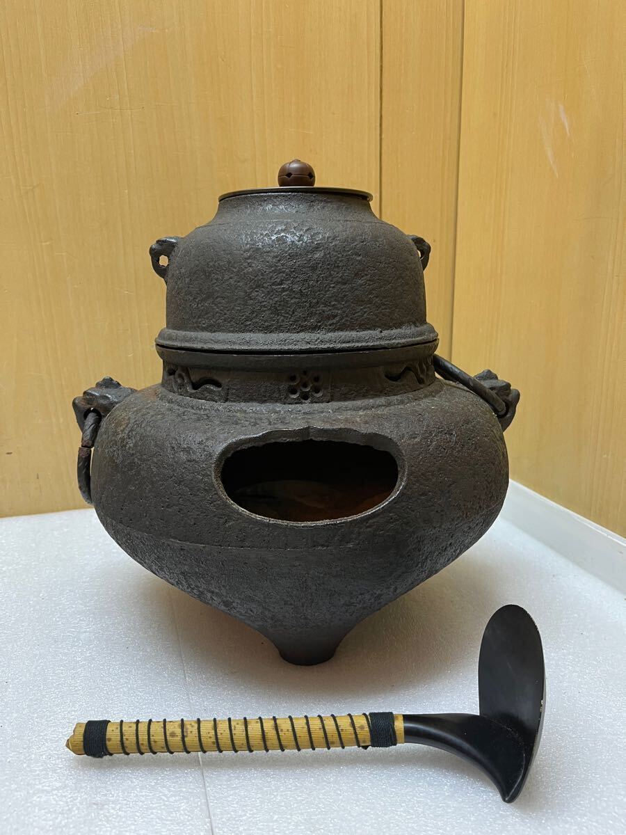 - RE1092 風炉釜 茶釜 鉄瓶 茶道具 湯沸かし 灰付 風炉 囲炉裏 鉄釜 三つ足 銅蓋 風炉 茶器 茶室 茶道 当時物 レトロ