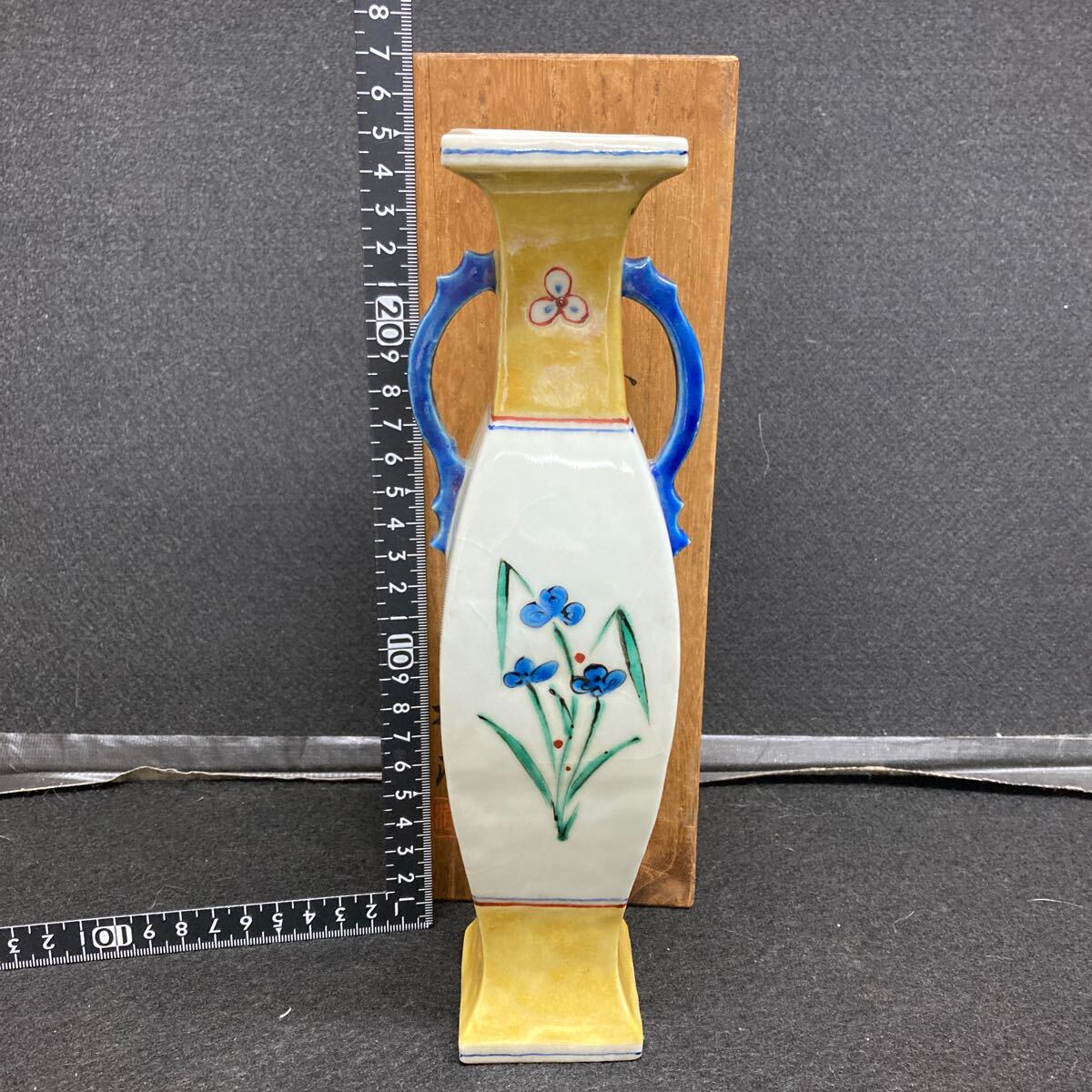 - 九谷焼き 宮川哲治造 色絵耳付き 草花紋花瓶 共箱付き アンテーク高さ25センチ 径約6.5センチ