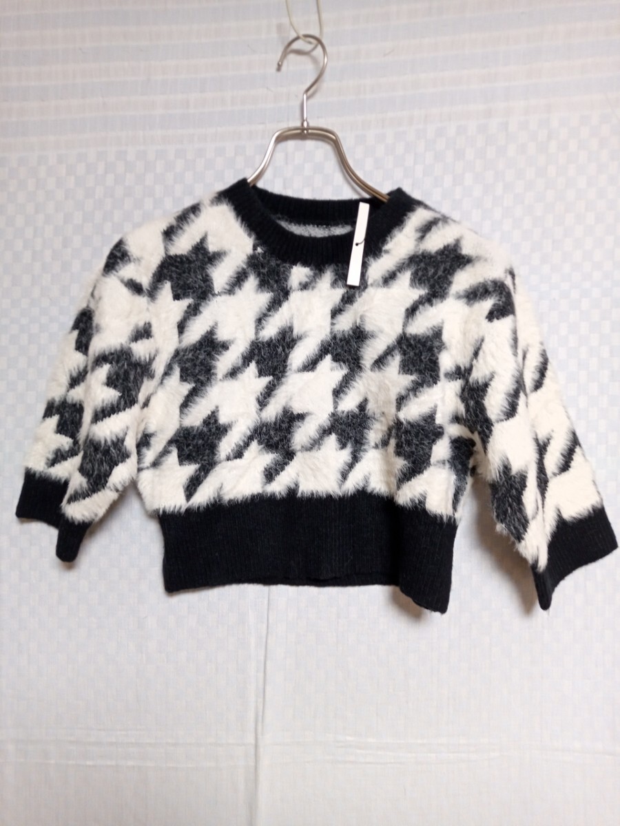 - 10806 ★★ 千鳥柄 五分袖 ニットセーター 白×黒 新品