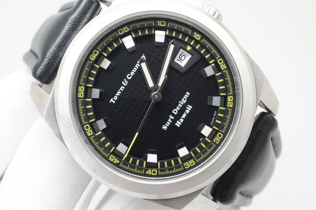 > A86●作動良好 美品 Town&Country タウン&カントリー Surf Designs Hawaii デイト 黒文字盤 メンズ腕時計 シルバー お洒落 クォーツ