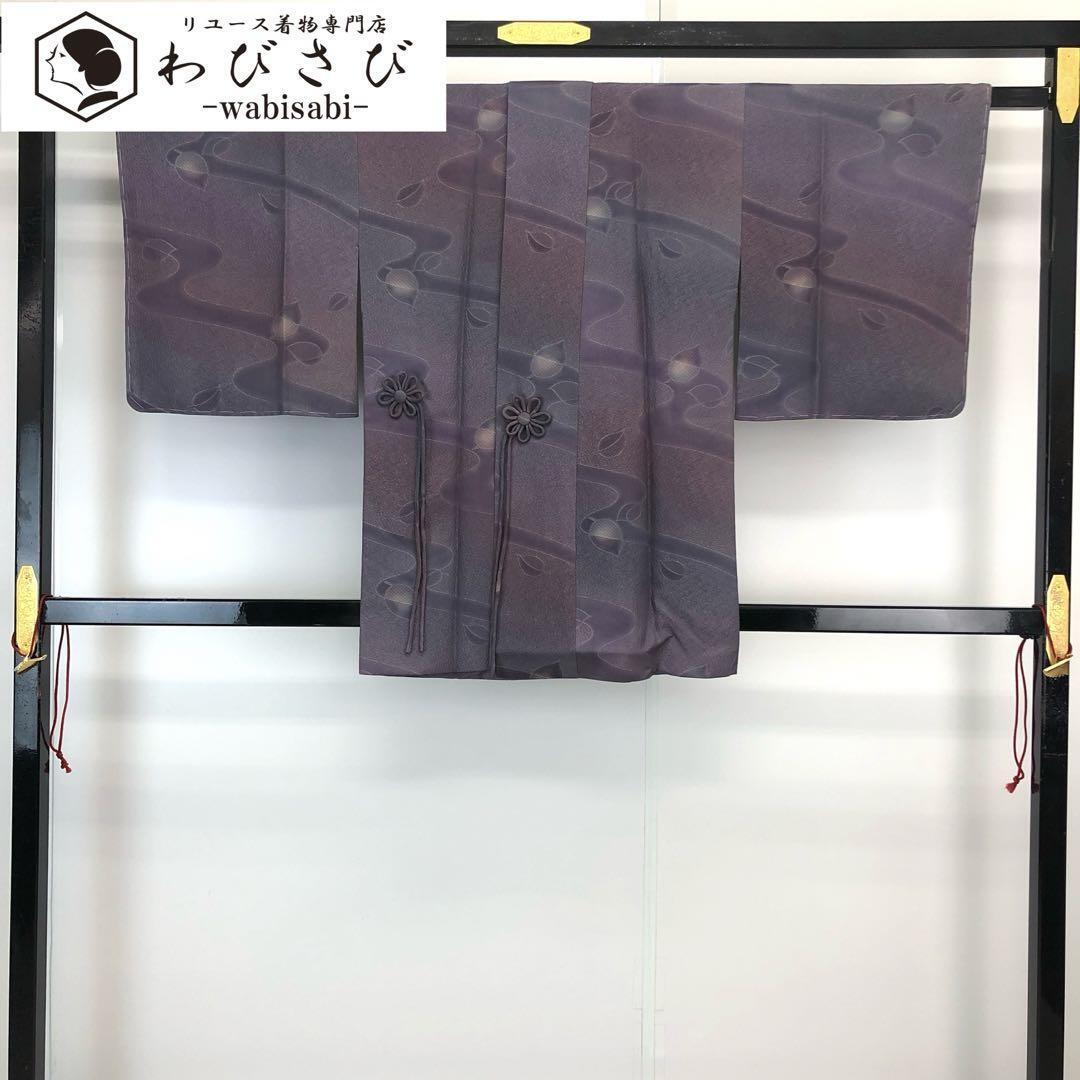 > 道中着 流水に葉模様 暈し 京紫色 縮緬 しつけ糸 H-4082 着物 きもの kimono 和服 和装 中古 リサイクル着物 【送料無料】