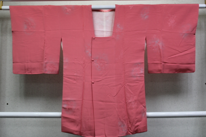 - きもの今昔8130 道行コートコレクション 正絹紋意匠生地 バラの花飛び柄地紋様 橙ピンク色 コート丈87cm