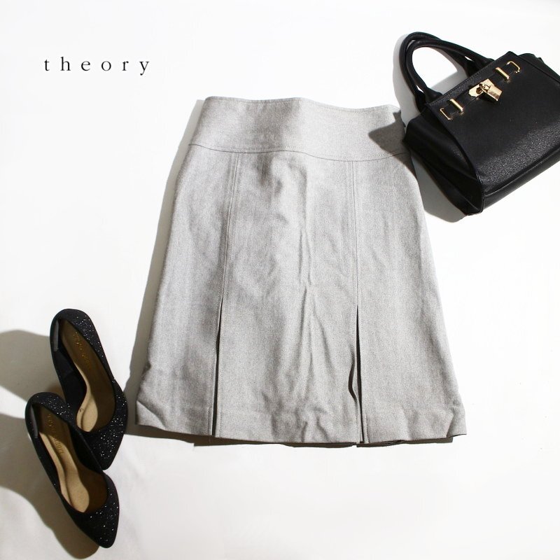 > 美品 セオリー Theory 秋 冬 毛98% ボックスプリーツ ウール Aライン フレアスカート ウエスト58 グレー 0 ウールスーツ 綺麗め オフィス