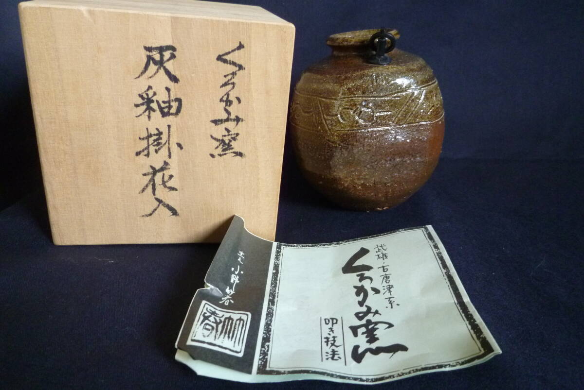 - 真作保証『くろかみ窯』武雄古唐津 代表作 叩き技法 灰釉掛花入 小野竹春 造 共箱 冊子付 50000円「鶴瓶の家族に乾杯」放映