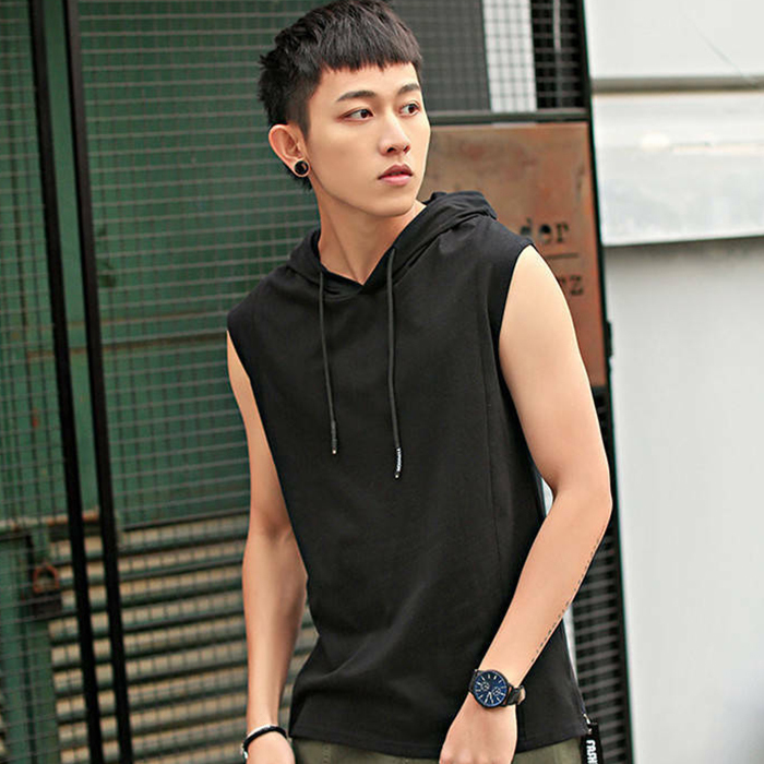 - タンクトップ ノースリーブパーカー メンズ フード付きTシャツ 無地 シンプル カジュアル 夏服 トップス 運動着 部屋着 Zty-1064 黒色 L