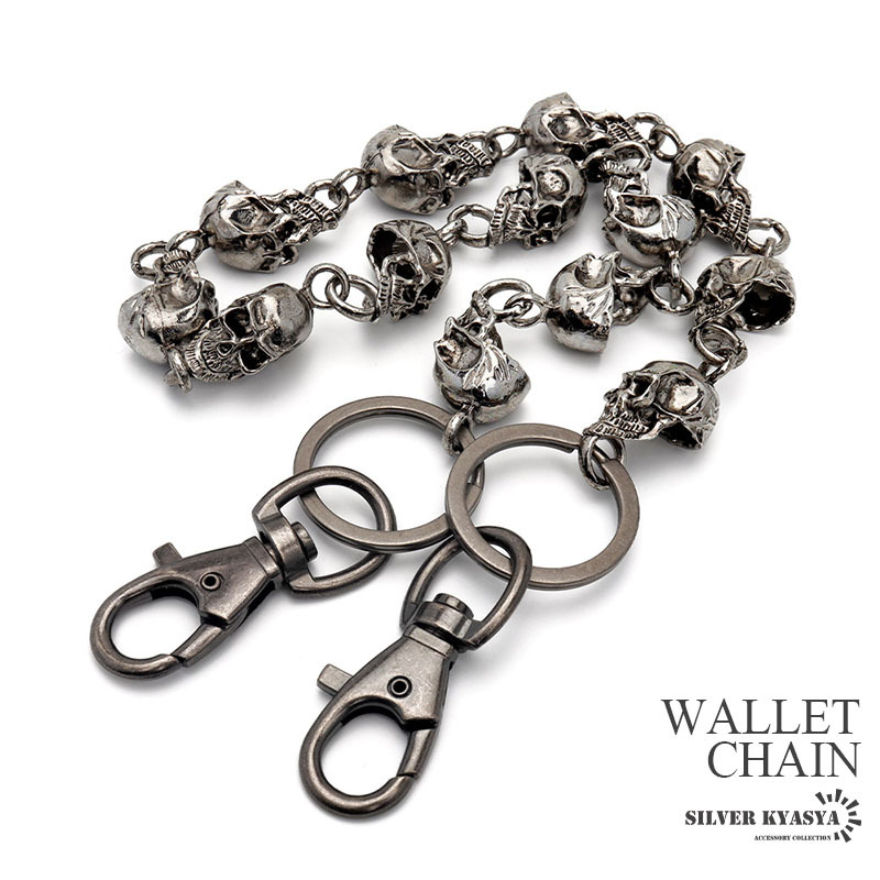 - ごつめ スカル ウォレットチェーン クローム ブラック メンズ 2クリップ 燻し風 財布 盗難防止 紛失防止