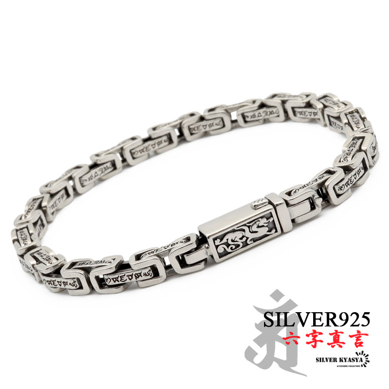 - 六字真言 ブレスレット メンズ シルバー925 チェーンブレスレット 銀 龍 ドラゴン 金剛杵 刻印 金属アレルギー