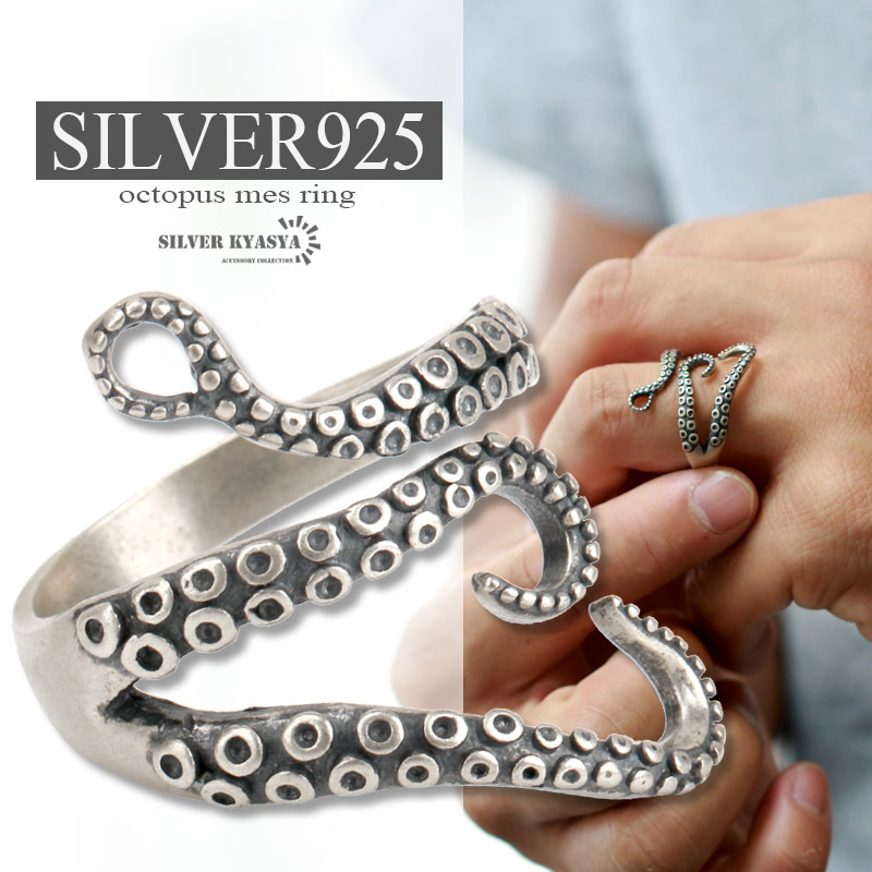 - タコ足リング シルバー925 オクトパスリング クラーケン 燻し加工 動物 アレルギー対応 フリーサイズ 19号 21号 23号